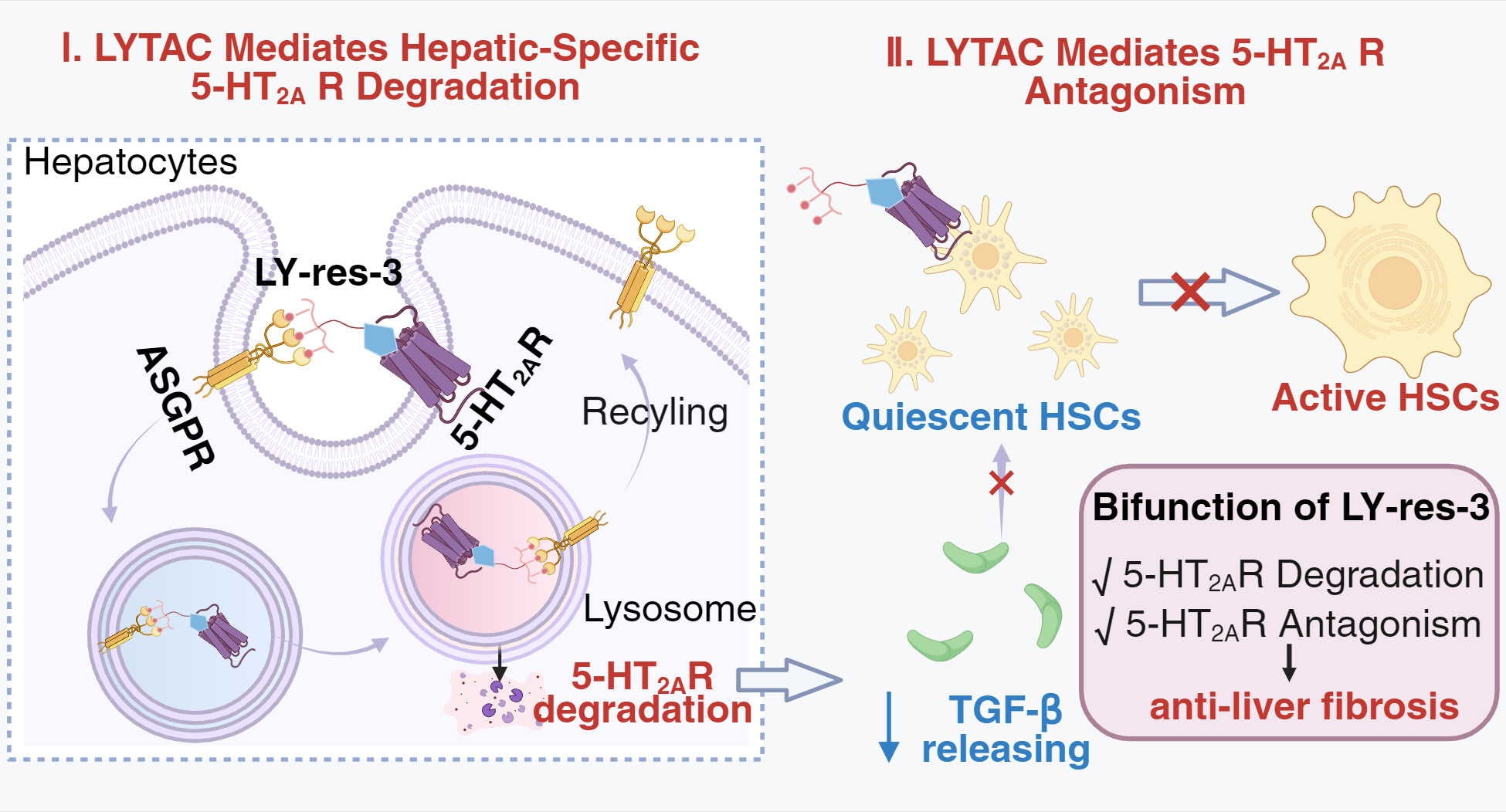 针对上述关键科学问题,团队利用溶酶体靶向嵌合体(LYTAC)策略,将肝实质细胞表面特异性唾液酸糖蛋白受体(ASGPR) 的配体Tri-GalNAc与5-HT2AR小分子拮抗剂analog18连接,设计合成了一系列靶向肝实质细胞降解5-HT2AR的LYTAC。结果表明,LY-res-3在5-HT2AR 降解效果方面表现最佳,且该LYTAC具有双重干预作用:(1)靶向肝实质细胞5-HT2AR,诱导其溶酶体降解,抑制TGF-β释放,从而降低HSCs活化;(2)与HSCs的5-HT2AR结合,持续拮抗该受体,进而抑制TGF-β信号通路。该双功能LYTAC通过协同拮抗与降解肝脏5-HT2AR,改善小鼠肝纤维化。综上,本研究为同步干预肝实质细胞-HSCs,影响细胞间互作提供新思路,为靶向5-HT2AR治疗肝纤维化提供了创新性策略。